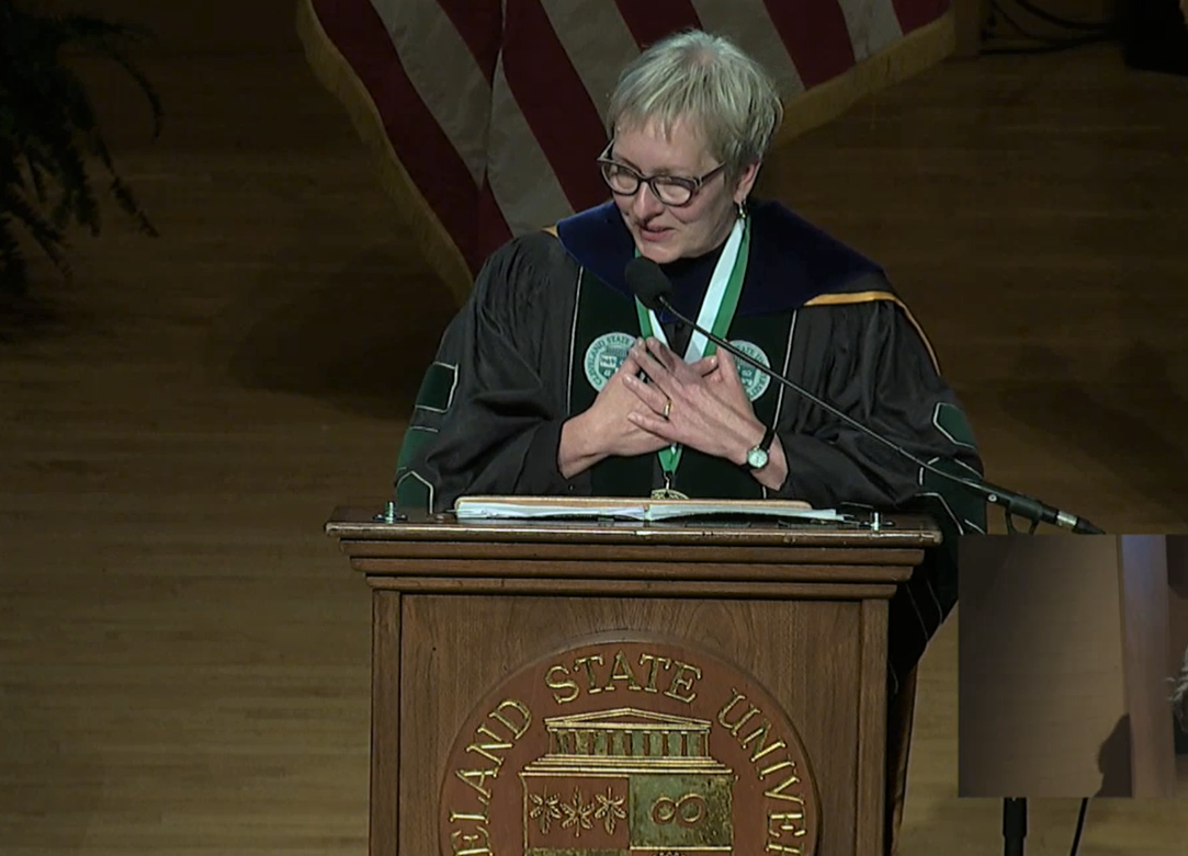 CSU’s pursuit of learning and creation of new knowledge “benefits our collective wellbeing on our campus, in our beautiful city full of strong partners and allies,” she added, noting the “remarkable economic, civic and natural resources” within and surrounding CSU’s campus. “I am so proud to say: We are Cleveland State University,” Dr. Bloomberg concluded.